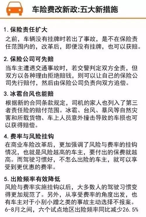 此前,保险费和违章出险挂钩,以往若一年中出现次数不出现2次,对次年的保费影响并不是很大,但费改新规加大了对违章出现次数的监控。只要今年有1次出险,次年就取消车险折扣;出现次数5次及以上的,保险将会直接翻倍!