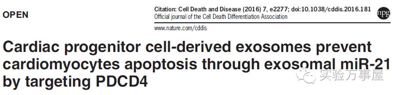 好吧,今天就跟你分析一下这篇文献,这篇文献的题目是:Cardiac progenitor cell-derived exosomes prevent cardiomyocytes apoptosis through exosomal miR-21 by targeting PDCD4,发表在Citation: Cell Death and Disease上,这是个Nature的子刊,有五分多。