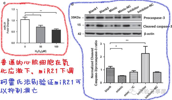 接着发现,巧的是,虽然普通心肌细胞氧化应激后,也会凋亡,但是普通心肌细胞的miR21会降低。(呃,会不会是也形成外泌体,都被带走了呢?氧化应激让细胞凋亡了,外泌体不是人,带着miR21跑路了。谁知道呢,故事这样就降不下去了。)通过柯霍氏法则的验证miR21会抑制凋亡(说简单点就是抑制或者过表达miR21后看凋亡表型出现还是恢复)。