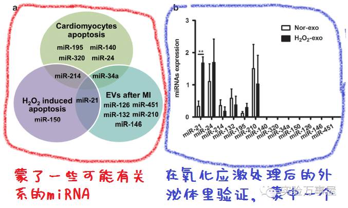 然后这个故事的轮廓就大概已经定型了,也就是氧化应激后祖细胞会形成外泌体,然后这外泌体里包含miR21,会抑制同样受到氧化应激的心肌细胞的凋亡。(有这能力抑制自己的凋亡不好么?为什么我并不是特别相信呢……)