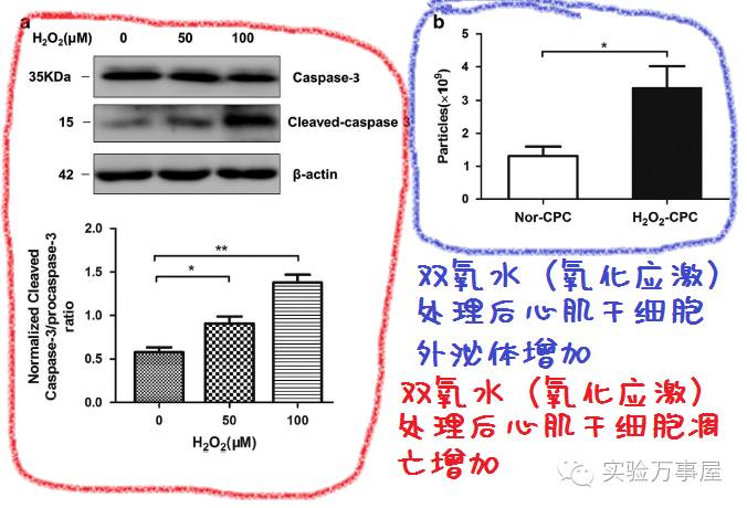 于是好巧,他们把双氧水加到了这个心脏祖细胞/心肌干细胞的培养基里(估计肯定也失手扔进去过别的,但是基本没效果,没效果的事情会写在文章里么?显然不会)。然而,加进去之后发现,凋亡增加了(谁喝一口双氧水估计也受不了的吧),当然双氧水是为了模仿氧化应激的。同时他们用烧钱的方法发现,卧槽心脏祖细胞/心肌干细胞产生的外泌体也增多了。