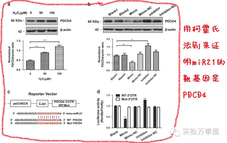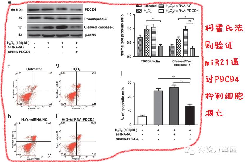 然后继续用柯霍氏法则验证这个氧化应激的凋亡跟PDCD4还有miR21有关。(应该都会有关的吧,miR21和PDCD4的凋亡啥的研究好多的)